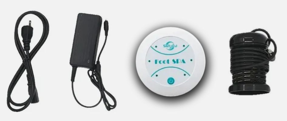 Wenn man sich so ein Fußbad-Paket bestellt, so erhält man eine Wanne, ein Netzstecker mit Netzteil und ein Koordinierunggerät, (rund) welches einen AN-AUS-Knopf enthält und in meinem Fall auch noch 6 Dioden (LEDs), welche als Zeitmesser alle 5 Minuten der Reihe nach an gehen und einen Ionisator .