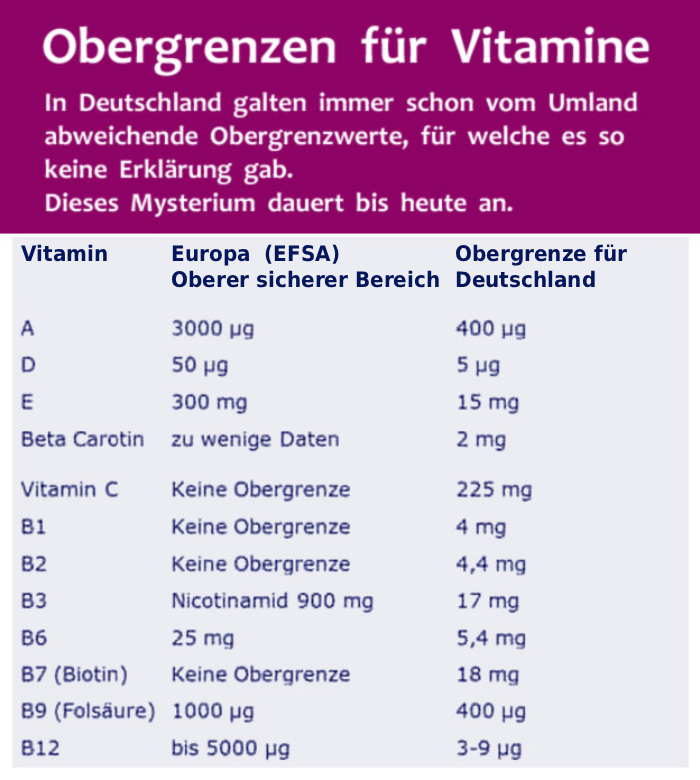 Hier noch eine Tabelle, die zeigt, dass die Obergrenzen für Vitamine in Deutschland oft viel niedriger angesetzt sind, als dies im restlichen Europa der Fall ist: