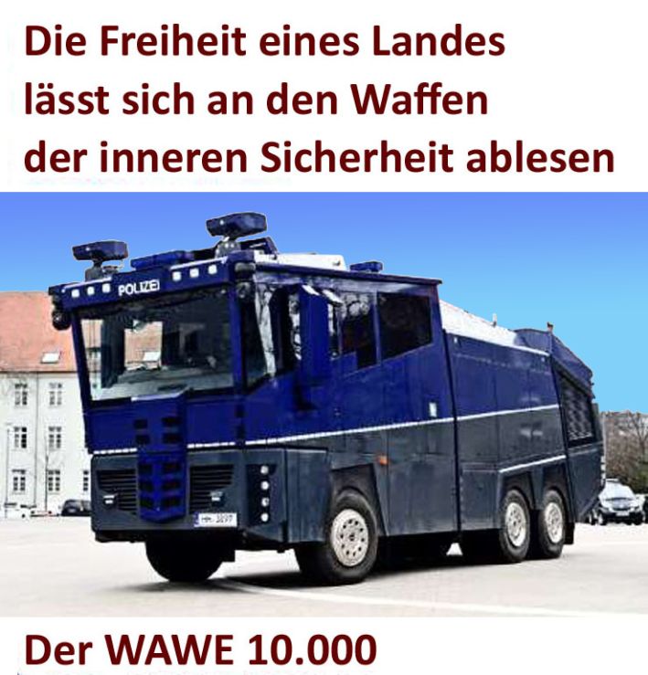 Gerade in Zeiten sozialer Unruhen und möglicher Abspaltungsversuche aus dem Verbund der EU glaube ich, dass Wasserwerfer-Fahrer ein Job mit großer Zukunft ist. Immer mehr Menschen bemerken, wie undemokratisch die EU aufgebaut ist und sehen einen EU-Ausstieg als unausweichlich an, will man eine EU-Diktatur verhindern. Und da Widerstand besonders dann gefordert ist und gefördert werden muss, wenn jemand versucht, die Demokratie abzuschaffen, verdient diese Bewegung volle Rückendeckung. Denn Hand aufs Herz: was Anderes ist die EU, als ein Diktatur-Instrument der weltweiten Banken- und Industrie-Kartelle?